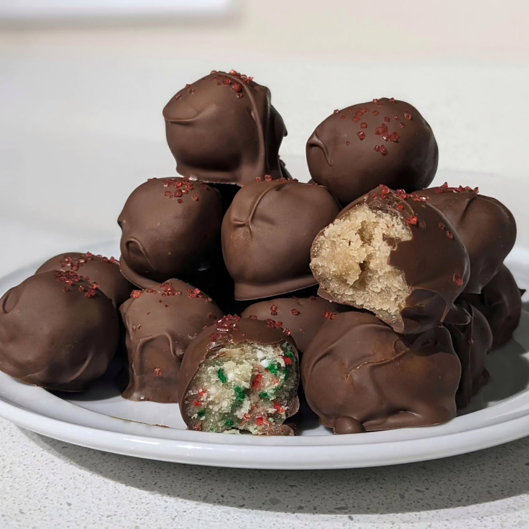 Enjoy your homemade chocolate-covered cookie dough bites straight from the fridge or at room temp!
